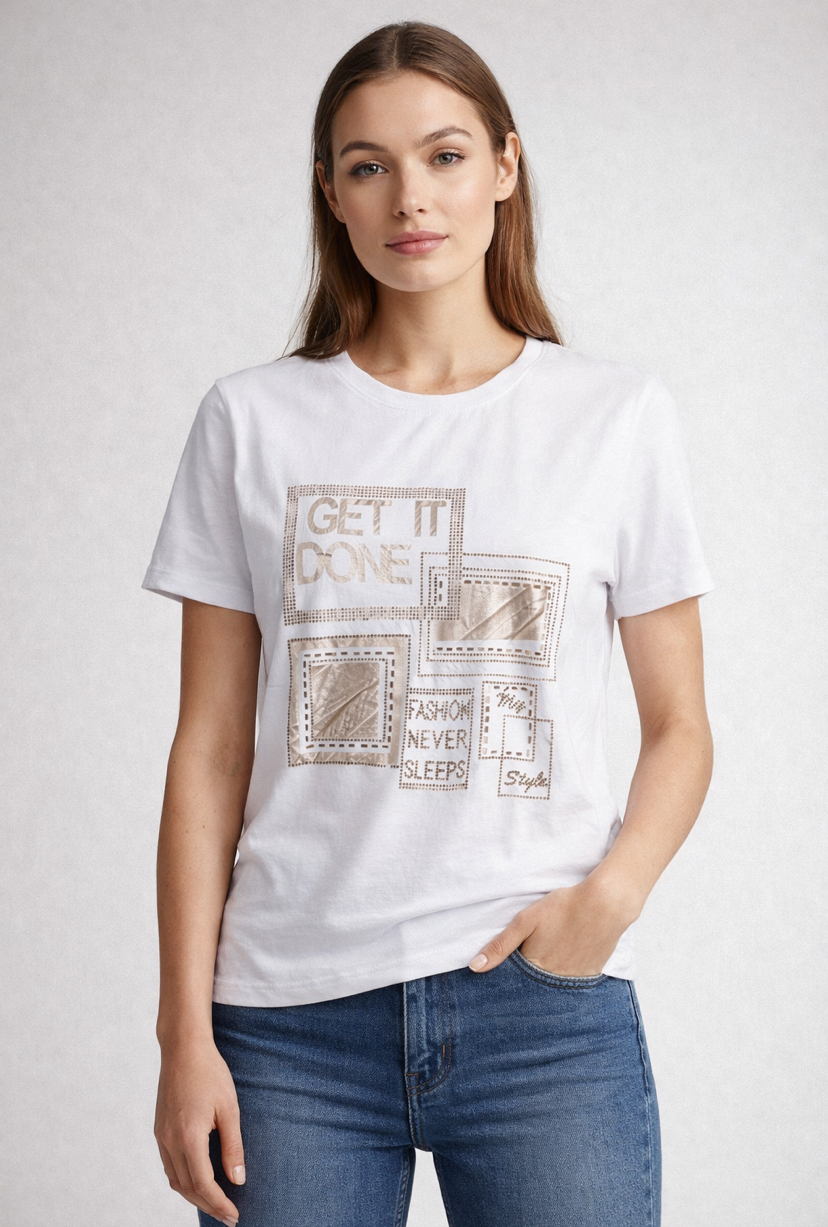 Белая женская футболка с коротким рукавом и круглым вырезом. Украшена стильным принтом с надписями «GET IT DONE» и «FASHION NEVER SLEEPS» в оттенках розового золота.