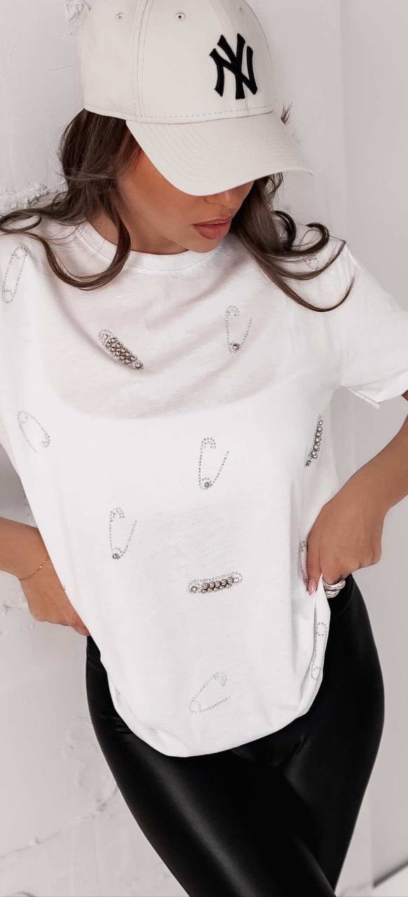 Белая женская футболка с коротким рукавом и круглым вырезом. Украшена декоративными элементами в виде булавок из страз, равномерно расположенных по всей поверхности. Смотрится стильно и необычно.