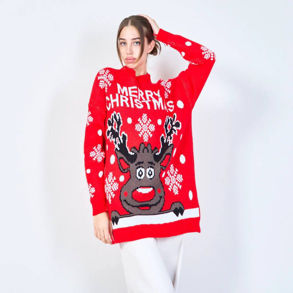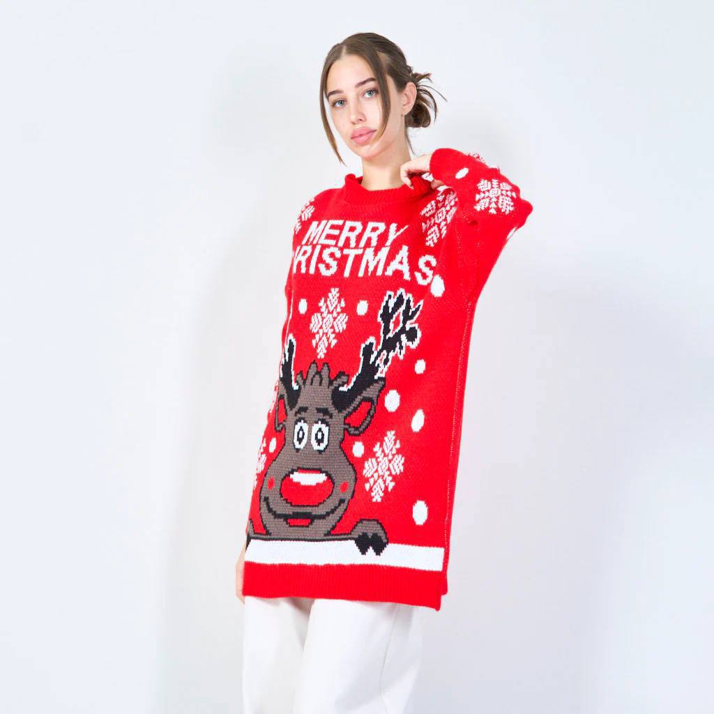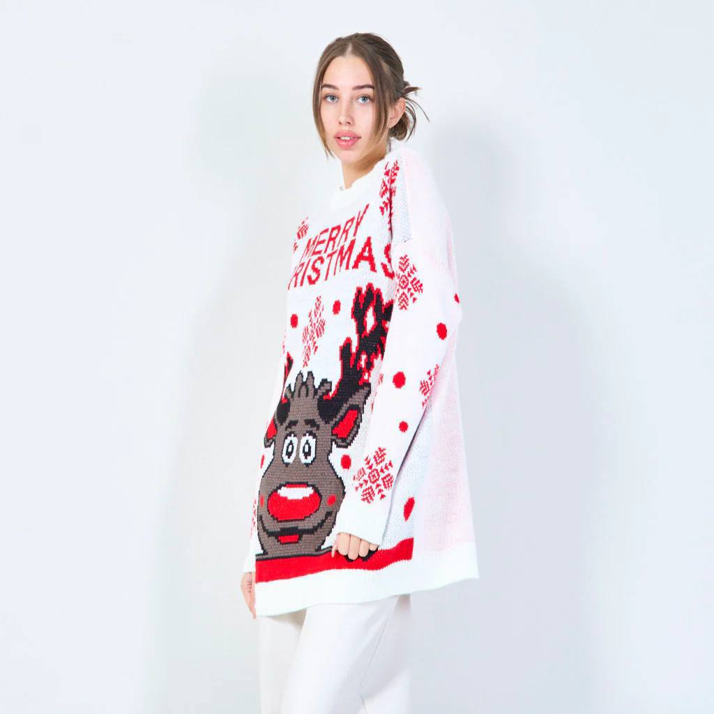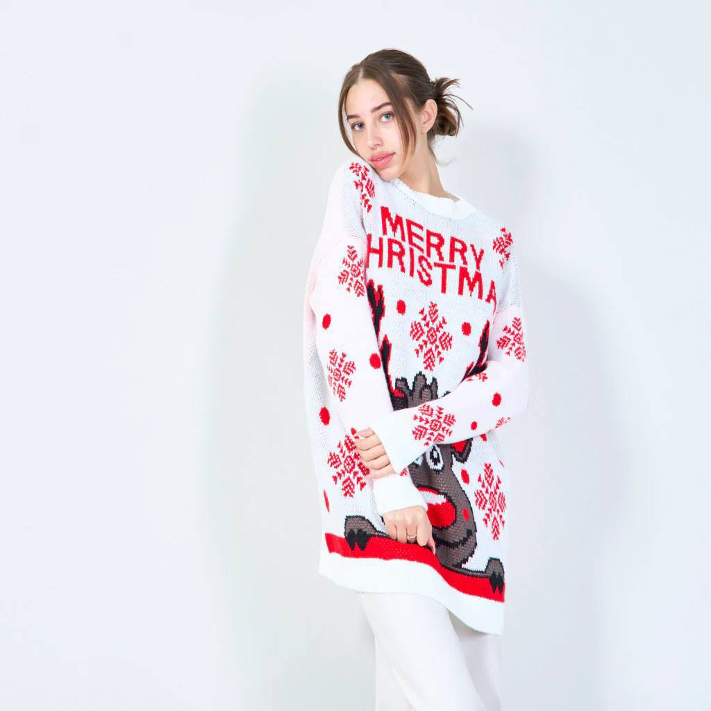 Новогодний вязаный свитер-платье с праздничным принтом и надписью Merry Christmas. Свободный, удлинённый фасон, длинные рукава, круглый вырез. Мягкий, тёплый и комфортный материал. Отлично смотрится на фигуре, подходит для зимнего сезона и праздничных образов.