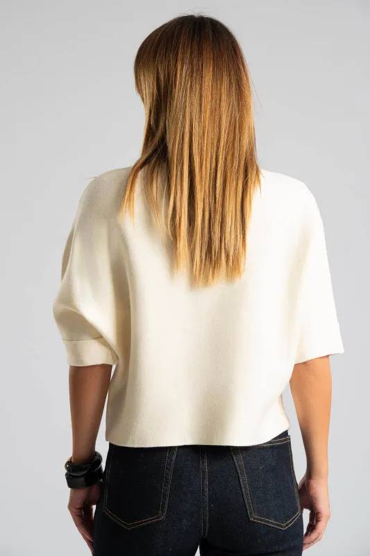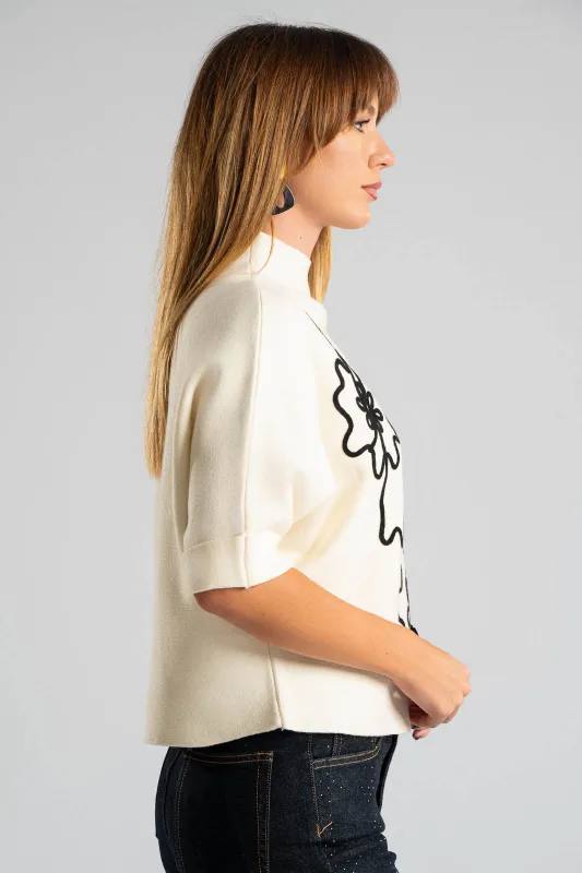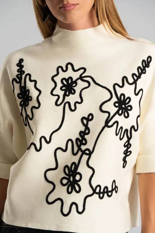 Свитер плотной вязки с элегантным вырезом лупето. Свободный фасон с рукавами «летучая мышь» и аккуратными отворотами обеспечивает комфорт и стильный силуэт. Спереди — нежный вышитый цветочный принт, который добавляет образу женственности и уюта.