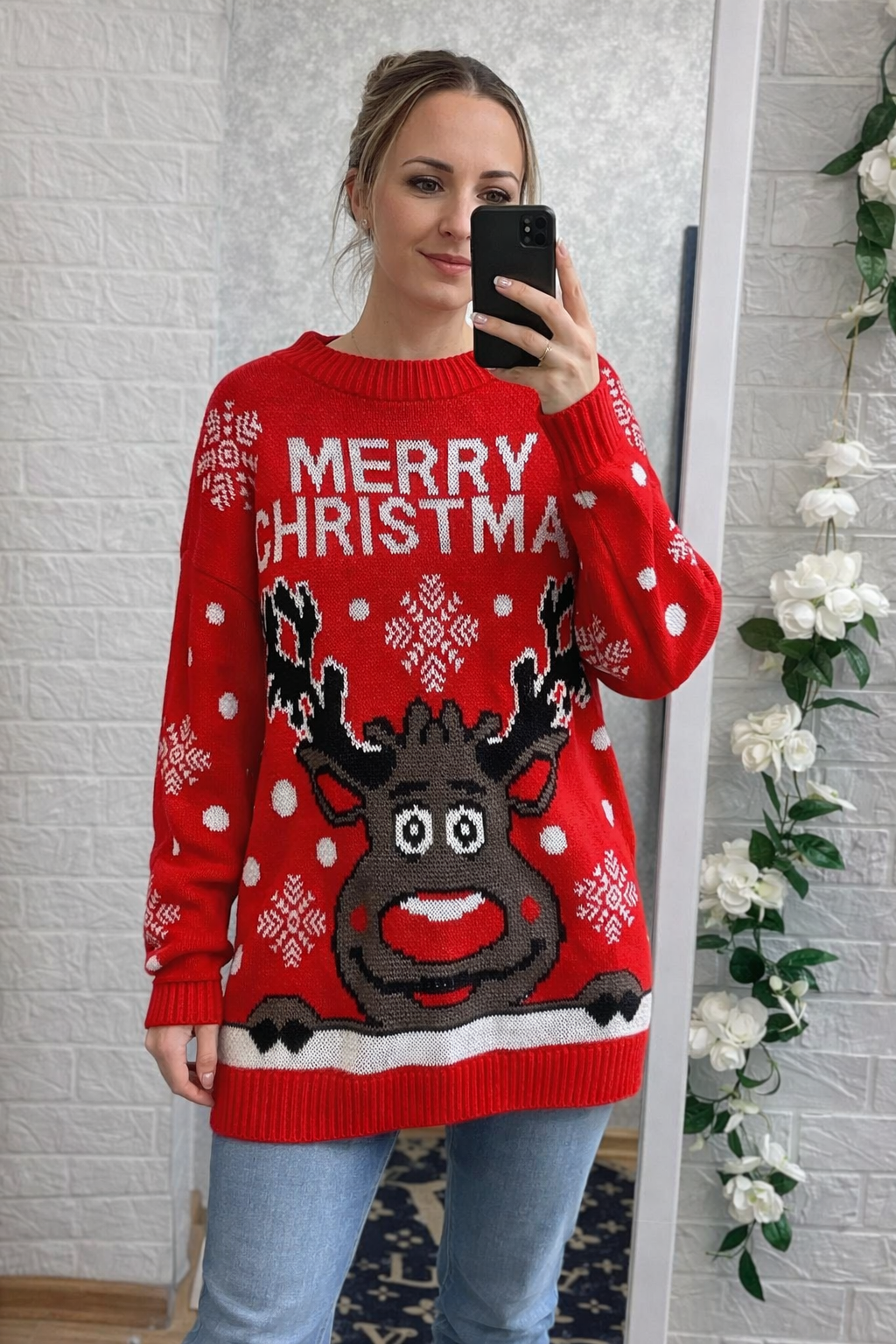Новогодний вязаный свитер-платье с праздничным принтом и надписью Merry Christmas. Свободный, удлинённый фасон, длинные рукава, круглый вырез. Мягкий, тёплый и комфортный материал. Отлично смотрится на фигуре, подходит для зимнего сезона и праздничных образов.
