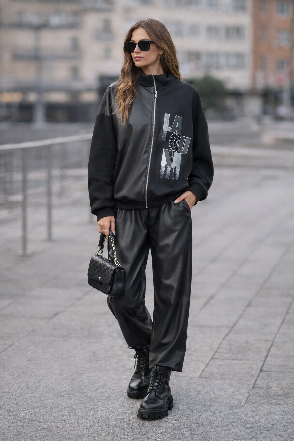 Современный костюм в чёрном цвете: свободные брюки на резинке и куртка на молнии. Комбинация эко-кожи и мягкого трикотажа делает модель комфортной и эффектной.